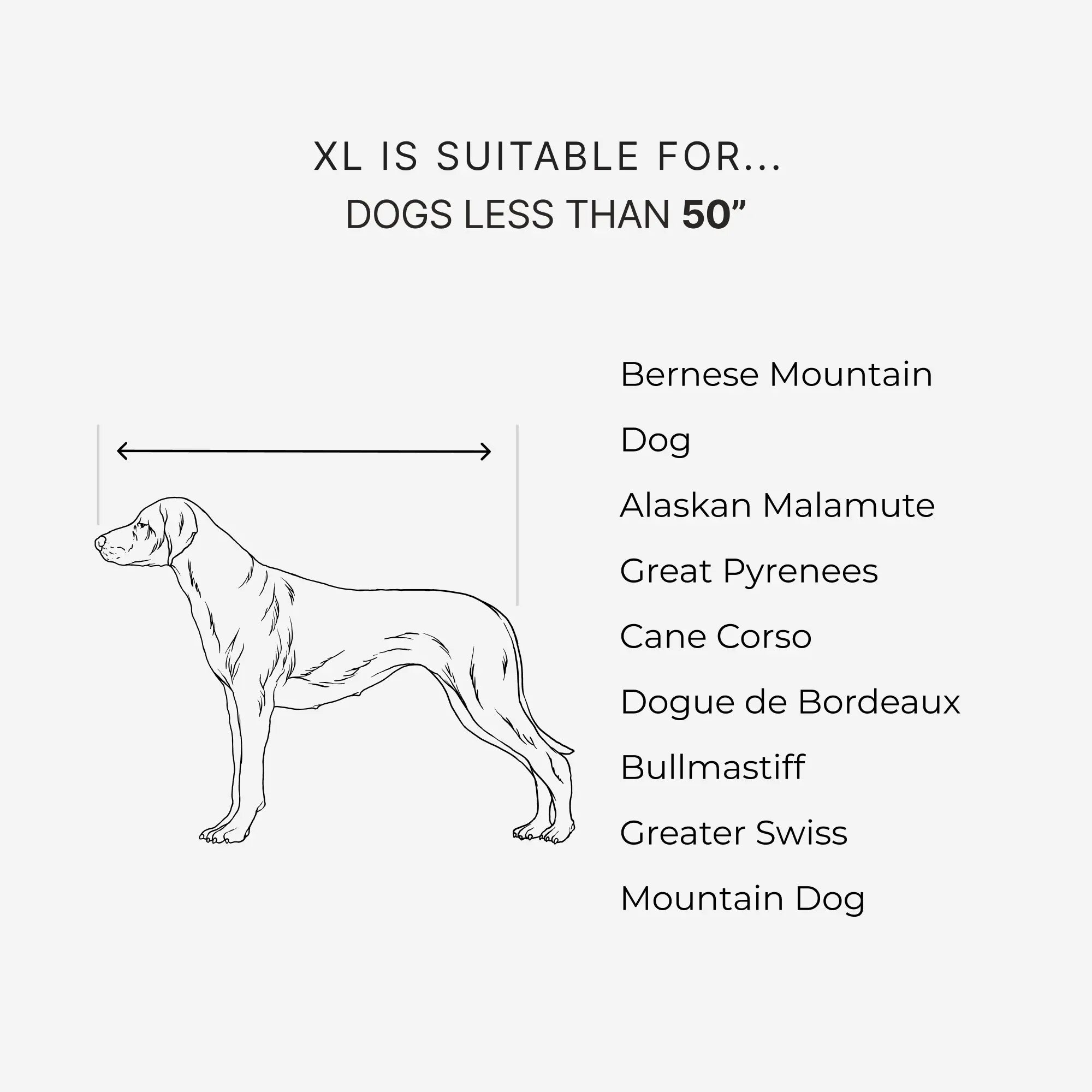 The XL Barney Bed is designed for dogs up to 50", making it perfect for larger breeds like Bernese Mountain Dogs, Cane Corsos, Alaskan Malamutes, Bullmastiffs, or for dogs who love to share their bed. Spacious and supportive, it’s built to hold their weight without sagging, giving these gentle giants the support and comfort they deserve.