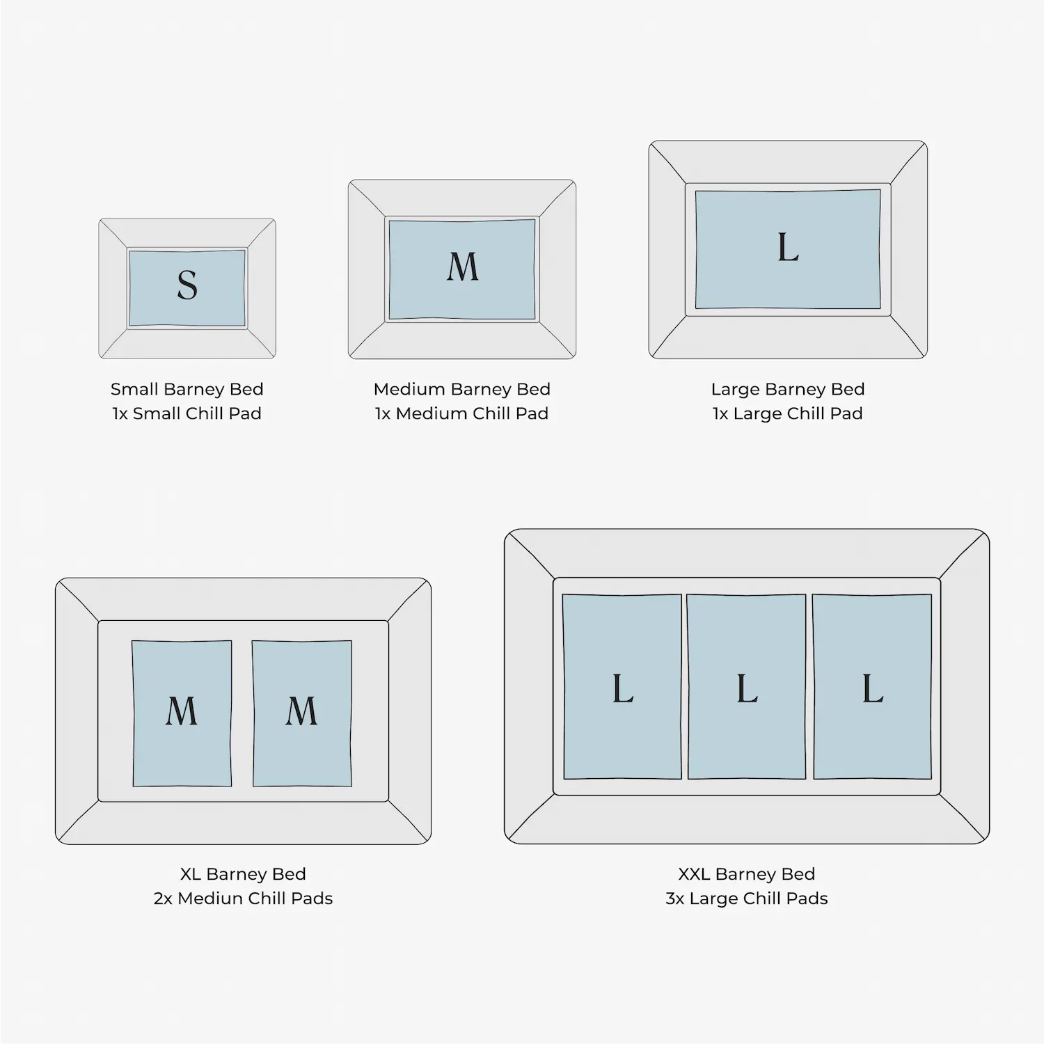 Lightweight, foldable, and made to fit seamlessly under any Barney Bed slip cover, the Chill Pad enhances your dog's sleep without disrupting the signature orthopedic support of the bed. Whether it’s a hot summer’s day or your dog just needs a little extra chill, this is the must-have addition to their Barney Bed. Choose the Chill Pad size that matches your Barney Bed.